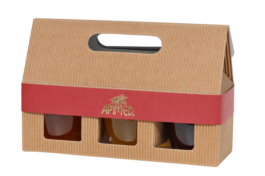 Gift box made of cardboard 3 x 250 g honey in amphora