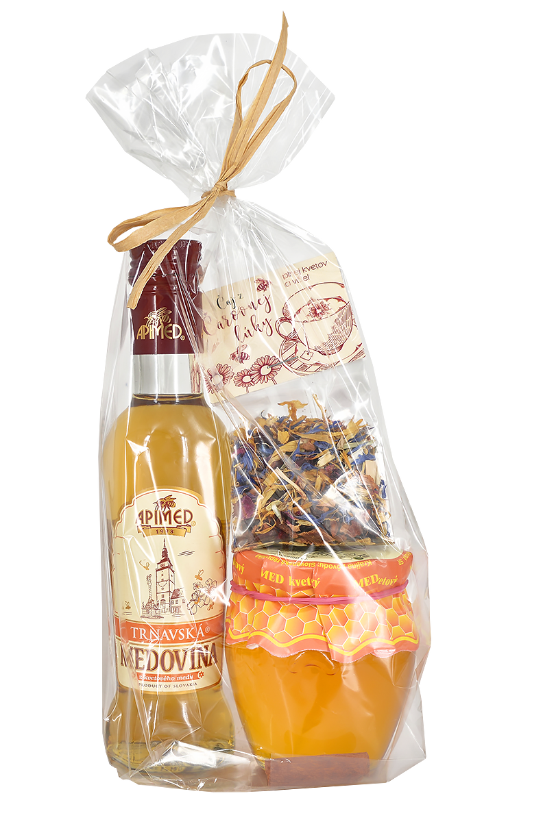 Darčekové balenie obsahuje: 250 g kvetový med amfora, 0,18 l Trnavskú medovinu a Čaj z čarovnej lúky 20g uložené v ozdobnom sáčiku s mašlou.