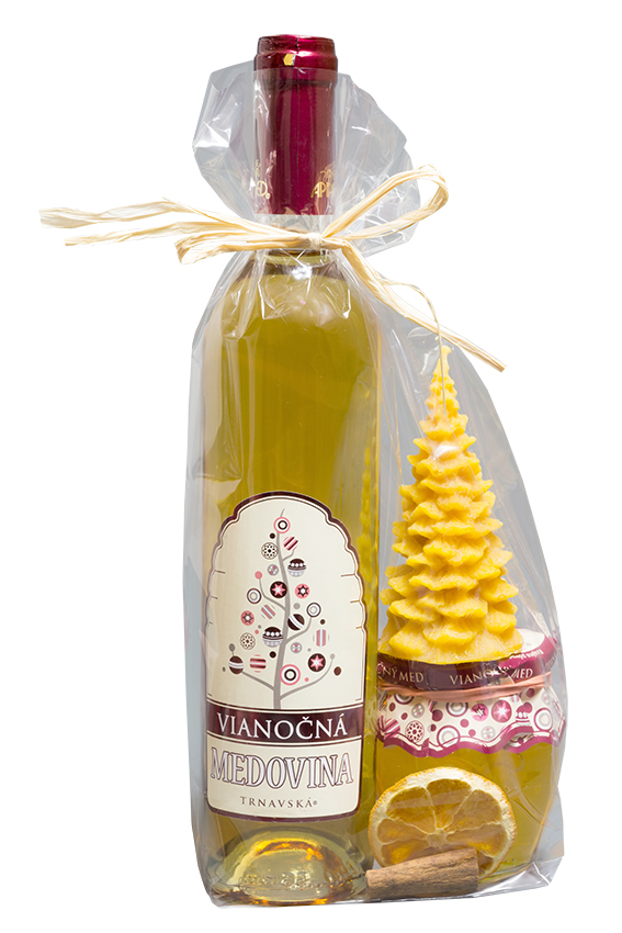 Darčekové balenie obsahuje: 250 g kvetový med vo vianočnom balení, 0.5 l Vianočná medovina a sviečka zo včelieho vosku uložené v ozdobnom sáčiku s mašlou