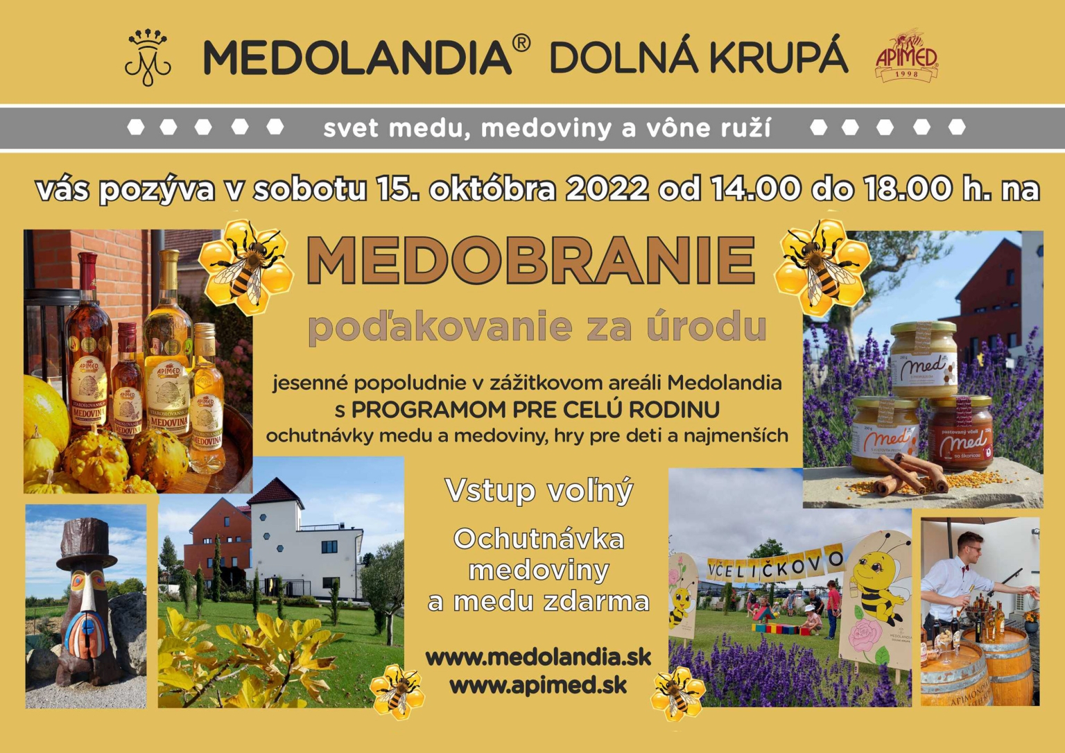 V sobotu 15.októbra v čase od 14,00 hod do 18,00 hod. sa koná v Medolandii podujatie „Medobranie“ – poďakovanie za úrodu spojené s ochutnávkou najlepších medov a medovín. Pre najmenších budú pripravené hry Včeličkovo v záhradách. Popoludnie plné hier na včielky, sladkostí a sladučkého čaju poteší malých i väčších.