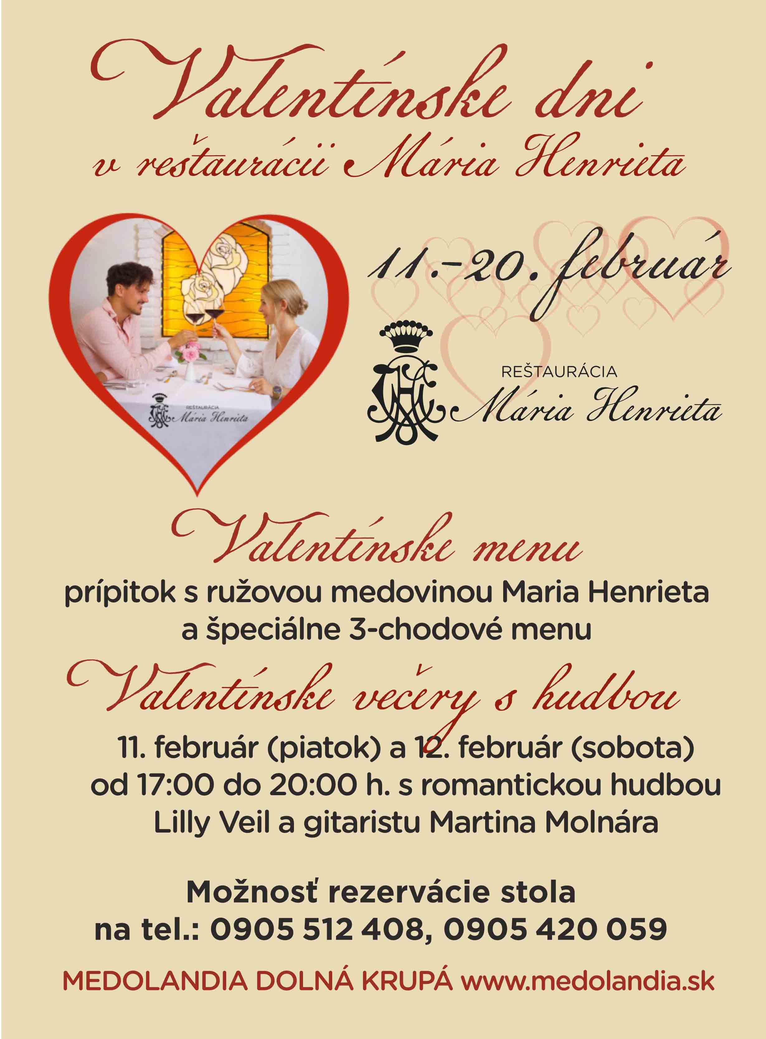 Valentín sa blíži a my v Medolandii sme pre vás v reštaurácii Mária Henrieta pripravili Valentínske dni od 11.2. do 20.2. so špeciálnym Valentínskym menu.