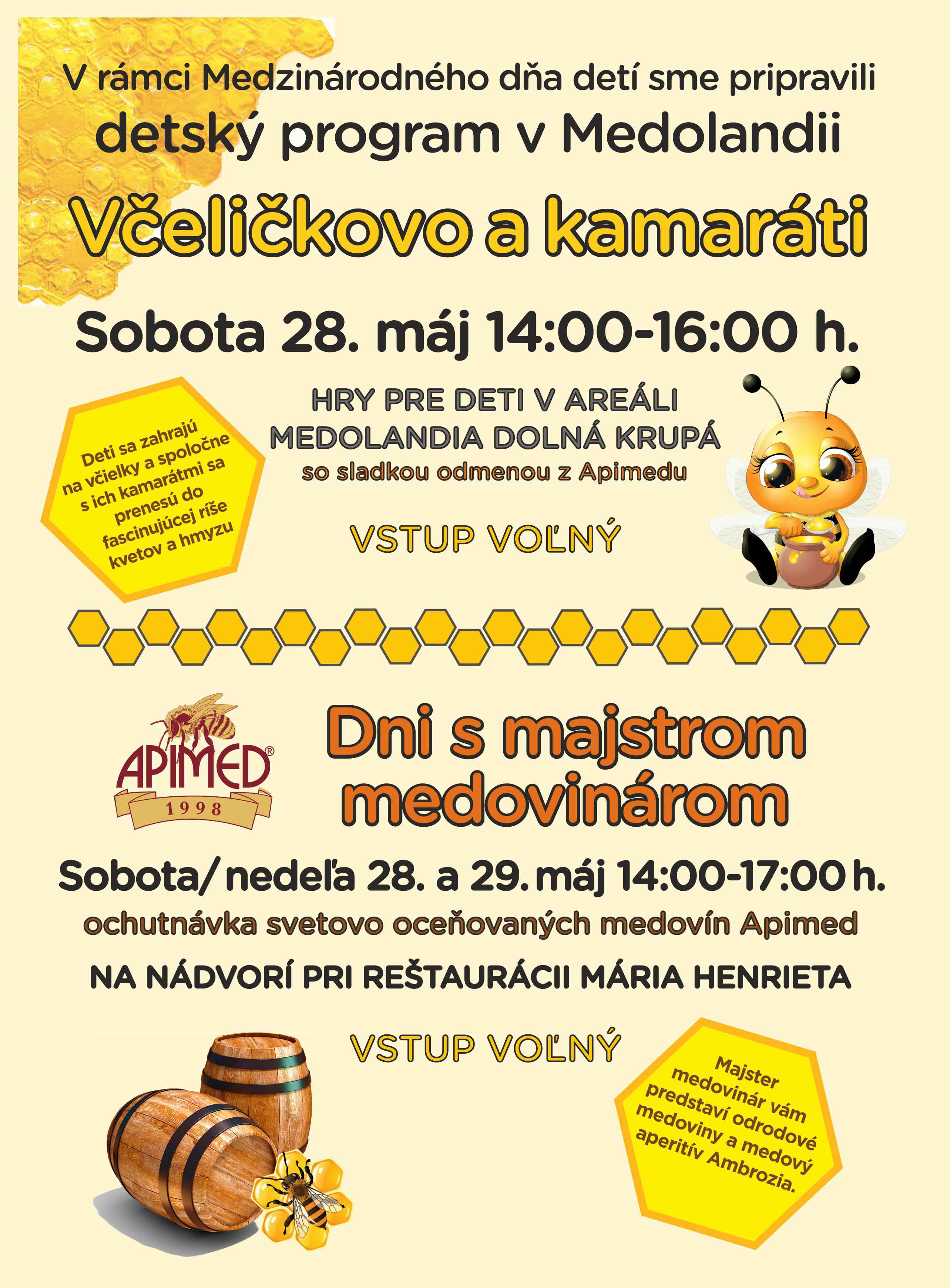Pozývame deti a rodičov stráviť príjemné popoludnie v Medolandii. Pre deti sú pripravené hry so včeličkovou tématikou a na záver dostanú aj sladkú odmenu.